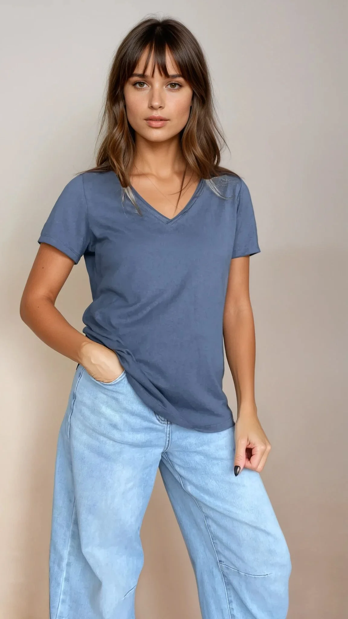 חולצת שרוול קצר מחשוף וי מבד כותנה בדוגמת סלאב, הדוגמנית לובשת מידה S